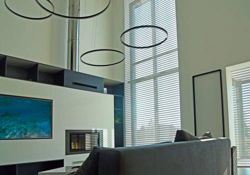 В апартаментах с большими или панорамными окнами практичнее всего использовать вертикальные жалюзи. Они не только придают помещению дополнительную высоту, но и с их помощью можно легко регулировать светопоток в солнечный день.